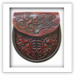 Sporran with celtic knotwork bird design on flap and multiple celtic knotwork bird design on front. Flap closes with a snap button fastener.(Straps and chains are included).