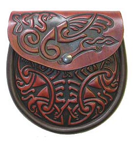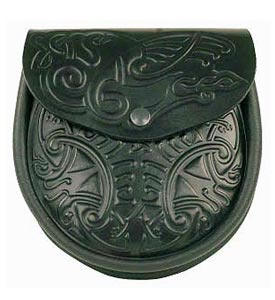 Sporran with celtic knotwork bird design on flap and multiple celtic knotwork bird design on front. Flap closes with a snap button fastener.(Straps and chains are included).