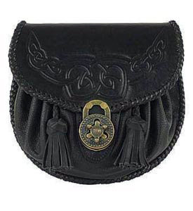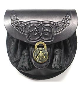Pouch sporrans with thick leather back and soft leather pouch front. Also has Celtic knot-work design embossed on the flap. The pouch is pulled shut using thong interweaved at the rim, and the flap is fastened using an antique turn lock.(Straps and chains are included).